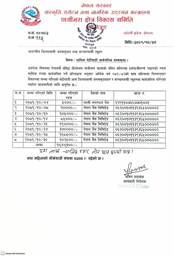 ताप्लेजुङ/ताप्लेजुङ स्थित पाथीभरा मन्दिरमा माघ महिनामा १० लाख रुपैयाँ भन्दा बढी भेटि संकलन भएको छ । पाथीभरा मन्दिरबाट माघ महिनामा १० लाख ४० हजार ३००रुपैयाँ भेटिपाति संकलन भएको हो । माघ महिनामा ४ हजार २ सय ४९ जना दर्शनार्थी पाथीभरा मन्दिर दर्शनका लागि पुगेको पाथीभरा क्षेत्र विकास समितिले जनाएको छ । माघ महिनामा चिसो मौसमका कारणले मन्दिरको दर्शनमा दर्शनार्थीहरु केहि मात्रामा कम मात्र जाने गरेको छ । चिसो मौसमका कारण पुस र माघ महिनामा मन्दिरको दर्शन गर्न अरु भन्दा कम मानिसहरु मात्र जाने गरेको र यद्यपी यो बर्ष माघ महिनामा पनि मन्दिरको दर्शन गर्न जानेको संख्या भने उल्लेख्य रहेको पाथीभरा क्षेत्र विकास समितिका कार्यकारी निर्देशक प्रजिन हाङवाङले बताउनु भएको छ ।