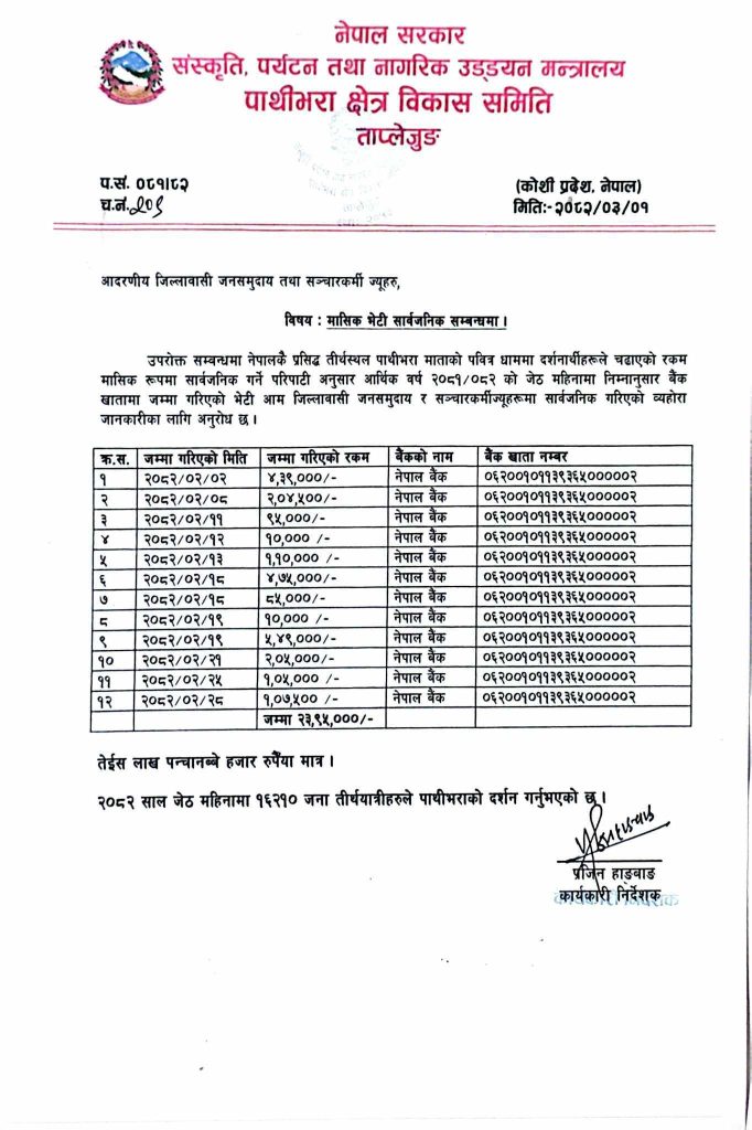 पाथीभरा मन्दिरमा जेठ महिनामा २३,लाख ९५,हजार रुपैयाँ मात्र भेटि संकलन,