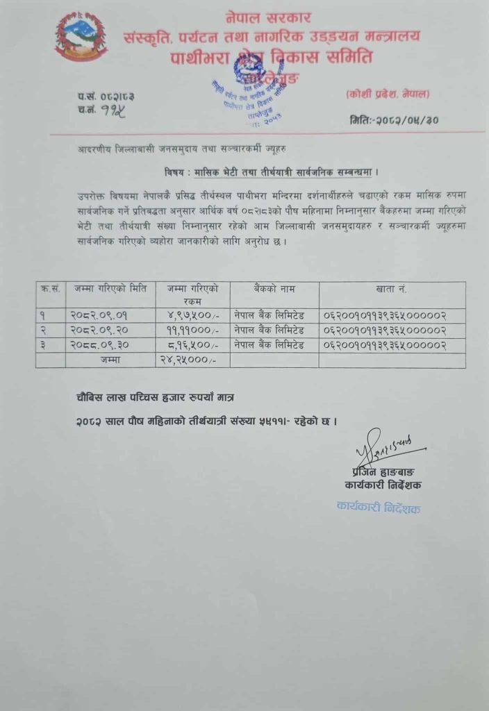ताप्लेजुङ/ताप्लेजुङ स्थित पाथीभरा÷ मुकुमलुङ, मन्दिरमा पुष महिनामा २४ लाख २५हजार रुपैयाँ मात्र भेटि संकलन भएको छ । पाथीभरा मन्दिरबाट गत मंसिर महिनामा मंसिरमा ७५ लाख ४९ हजार रुपैयाँ भेटी सङ्कलन भएको पाथीभरा क्षेत्र विकास समितिले जनाकारी प्राप्त गराएको थियो । पुष महिनामा मात्र ५,हजार ९ सय ११,जना दर्शनार्थीले पाथीभरा मन्दिर दर्शनका लागि पुगेको पाथीभरा क्षेत्र विकास समितिले जनाएको छ । गत महिनामा मन्दिरको दर्शनमा आउने दर्शनार्थीहरु चिसो मौषमले केहि मात्रामा संख्या घटेको पाथीभरा क्षेत्र विकास समितिले जानकारी गराएको छ । त्यसैले सदाझैं कार्तीक र मंसिर,पुष, महिनामा पनी मन्दिरको दर्शन गर्न आउने धेरै संख्याको मात्रा भन्दा कमी मानिसहरु जाने गरेको र यद्यपी यो बर्ष कार्तीक र मंसिर,पुष, महिनामा पनि मन्दिरको दर्शन गर्न जानेको संख्या भने घढ्दो उल्लेख्य रहेको पाथीभरा क्षेत्र विकास समितिका कार्यकारी निर्देशक प्रजिन हाङवाङले बताउनु भएको छ ।