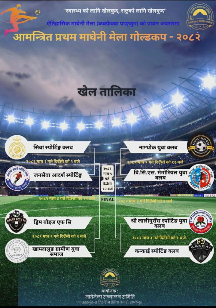 ताप्लेजुङ/ फक्ताङलुङ गाउँपालिका वडा नम्बर ३ लिङखिम सिवाँ बजारमा प्रथम आमन्त्रित माघे मेला २०८२ को खेल सञ्चालन हुने भएको छ । सिवाँमा हुने आमन्त्रित प्रथम माघे मेला गोल्डकप माघे मेला सञ्चालन समिति र सिवाँ स्पोर्टिङ क्लबले प्रथम आमन्त्रित माघे मेला २०८२ को खेल सञ्चालन हुने शनिबार पत्रकार सम्मेलन मार्फत सार्वजनिक गरेको हो।उक्त गोल्डकपको खेल तलिका टाईसिट अनुसार ८ टिम सहभागी हुनेछन् र उद्घाटन समारोहको खेलमा सिवाँ स्पोर्टिङ क्लब र मैवाखोला ढुङ्गेसाँघु जनसेवा आदर्श स्पोर्टिङ क्लबसँग खेल्नेछ।त्यसपछि दोस्रो खेलमा माघ २ गते ड्रिम बोइज एफ.सि फुटबल क्लब धनकुटाको र तेर्हथुम खाम्लालुङ ग्रामीण युवा समाज टिमसँग खेल हुने भएको छ। तेस्रो दिनको खेलमा माघ २ गते नै नाम्थोक युवा क्लब पाँचथर र बि.सि.एस मेमोरियल युवा क्लब साउदेन ताप्लेजुङ बीच खेल हुने भएको छ । पहिलो चरणको अन्तिम खेलमा माघ ३ गते ताप्लेजुङको सिदिङ्बा स्थित लालीगुराँस स्पोर्टिङ युवा क्लब र झापाको कन्काई स्पोर्टिङ क्लब हुने भएको छ। माघ ४ गते दुईवटा सेमि फाइनल खेल हुनेछन् भने ५ गते फाइनल खेल हुने मागे मेला आयोजक सञ्चालन समितिले जनाएको छ । गोल्डकपको प्रतियोगितामा विजेताले नगद ३ लाख ५० हजार ८२ रूपैयाँ र उप विजेताले १ लाख ७५ हजार ८२ रूपैयाँका साथ ट्रफी मेडल र प्रमाण पत्र पाउने छन् । प्रत्येक खेलका म्यान अफ द म्याच हुनेलाई नगद दुई हजारका साथ प्रमाण पत्र दिइनेछ । सर्वोत्कृष्ट खेलाडीले नगद ५ हजार रुपैयाँका साथ ट्रफी र प्रमाणपत्र पाउँदा अन्य विधागत तर्फ उत्कृष्ट साथ ट्रफी मेडल र प्रमाणपत्र दिने भएको छ । माघ ४ गते बृहत सांस्कृतिक कार्यक्रमको आयोजना गरिनु का साथै नेपालका चर्चित राष्ट्रिय कलाकार तारा प्रकाश लिम्बु,दिपा सुहाङ,बादल लिम्बु,सहितका अन्य स्थानीय कलाकारहरूले सांस्कृतिक कार्यक्रममा भाग लिने भएको माघे मेला सञ्चालन समिति तथा क्लबका संरक्षक दुर्गा मिधुङ लिम्बुले बताउनु भएको छ । त्यसै अनुसार प्रतियोगिता सहितका सबै कार्यक्रम सम्पन्न गर्न करिब २५ लाख रुपैयाँ लाग्ने अनुमान गरिएको र फक्ताङलुङ गाउँपालिका पालिकाको वडा नम्बर ३ सहितका पालिकाका वडा दाता,संस्था दाता व्यक्तिहरूको सहयोगमा आय स्रोत संकलन हुने आयोजकले बताएको छ । माघे मेला राणा शासनकाल देखि नै स्थानीय सुब्बाहरूले माघे मेला कक्फेवा तंगनाम को अवसरमा लगाउने गरेको र द्वन्द कालको समयमा केही स्थागित भएतापनि उक्त मेला स्थानीय मार्फत फेरि सुरुवात गरिएको माघे मेला सञ्चालन समिति आयोजकले जनाएको छ ।